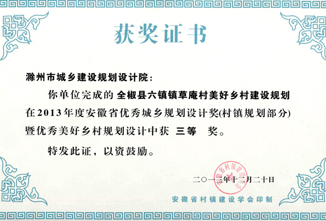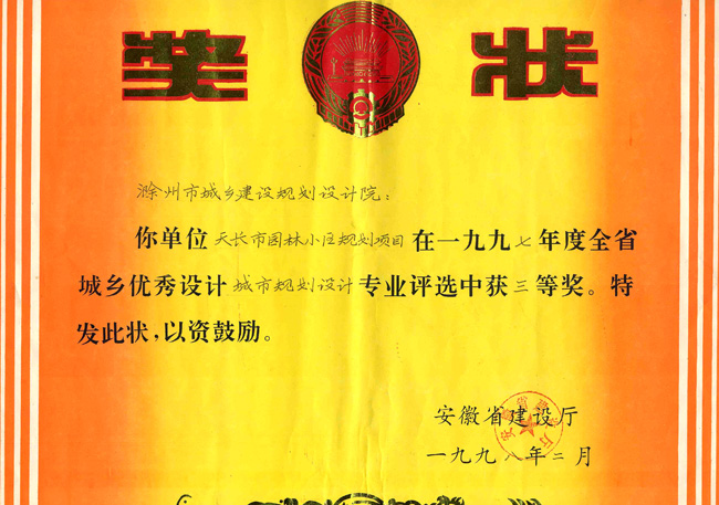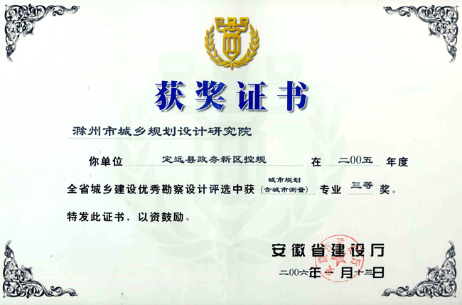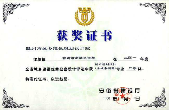 滁州市經(jīng)開(kāi)區(qū)地形圖測(cè)繪規(guī)劃獲獎(jiǎng)證書(shū)