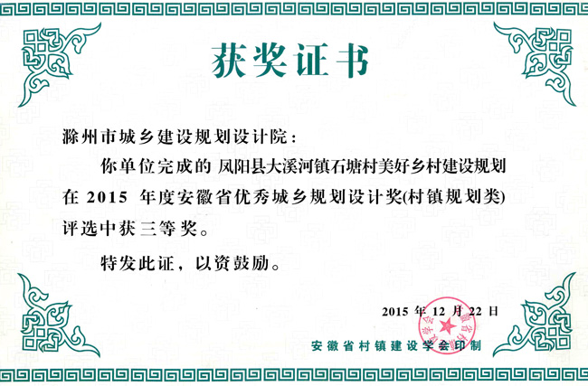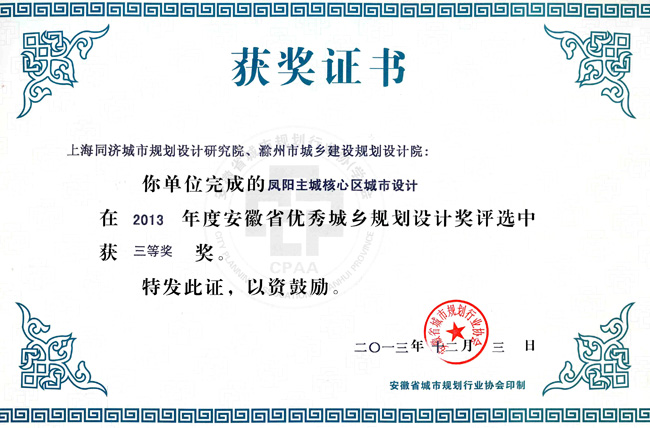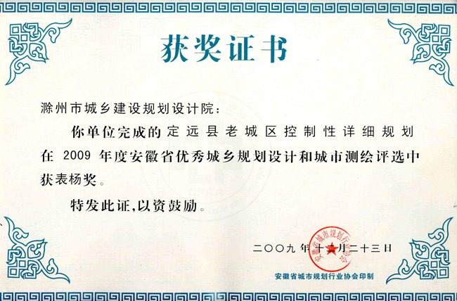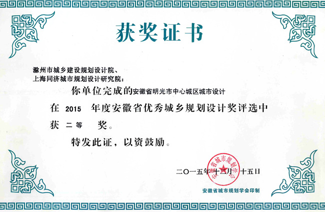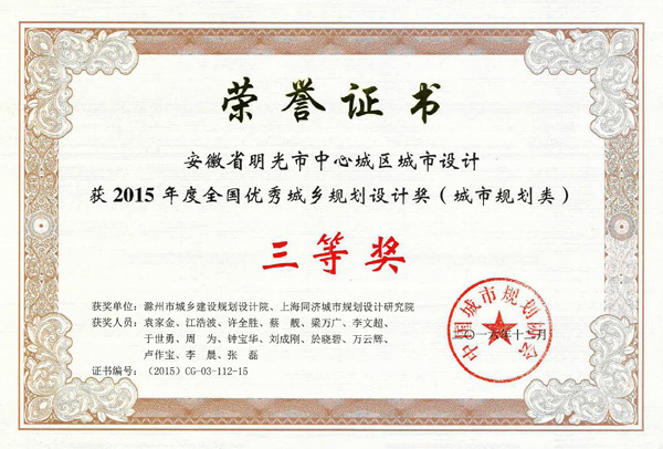 明光市中心城區(qū)規(guī)劃獲獎(jiǎng)證書(shū)