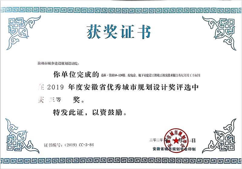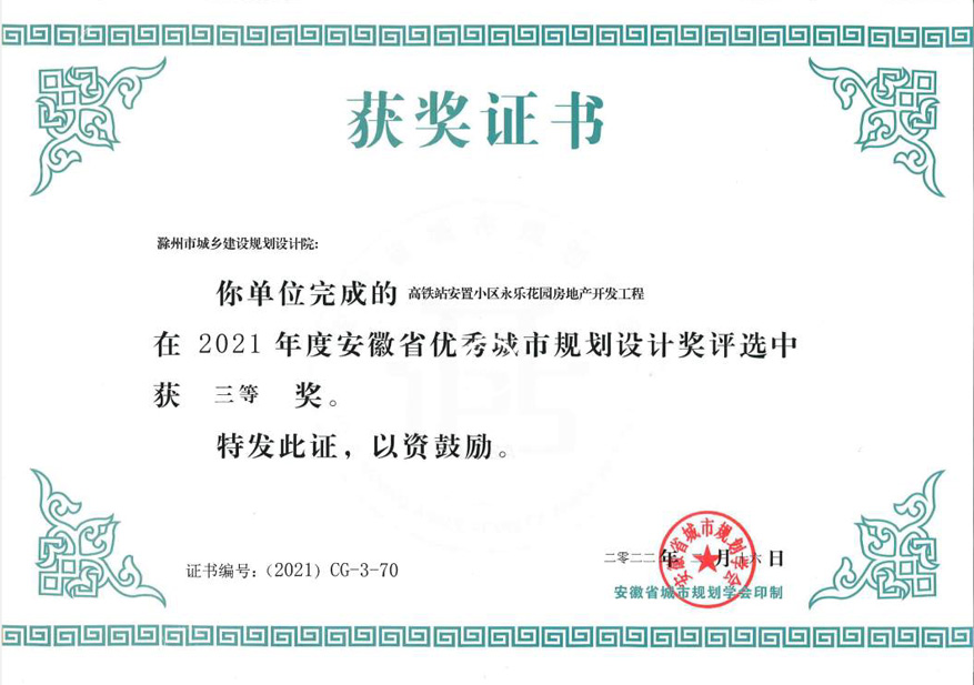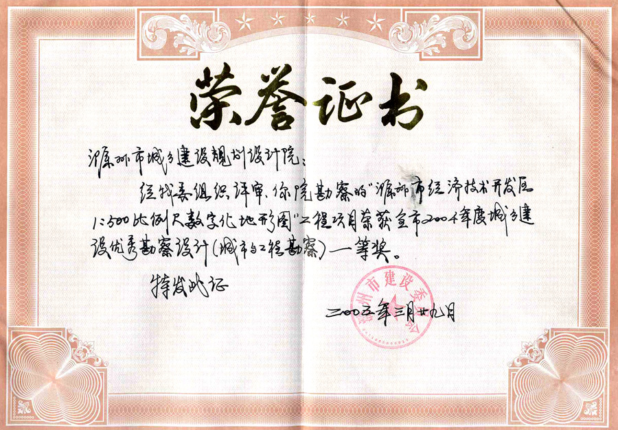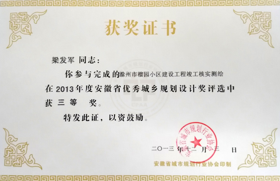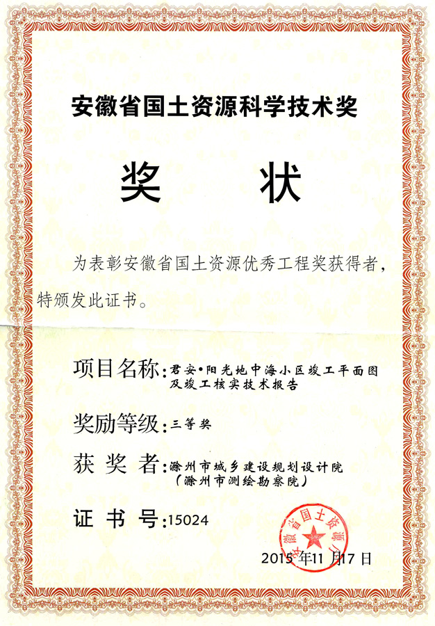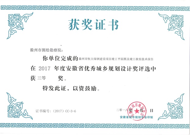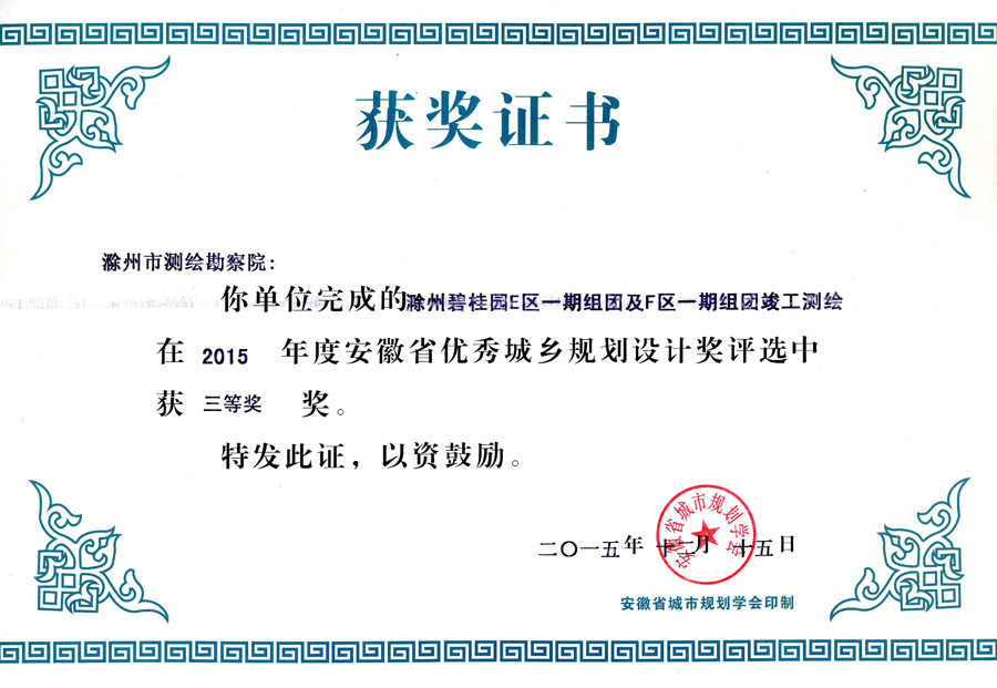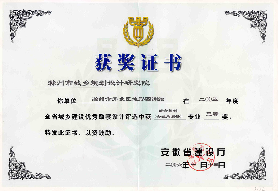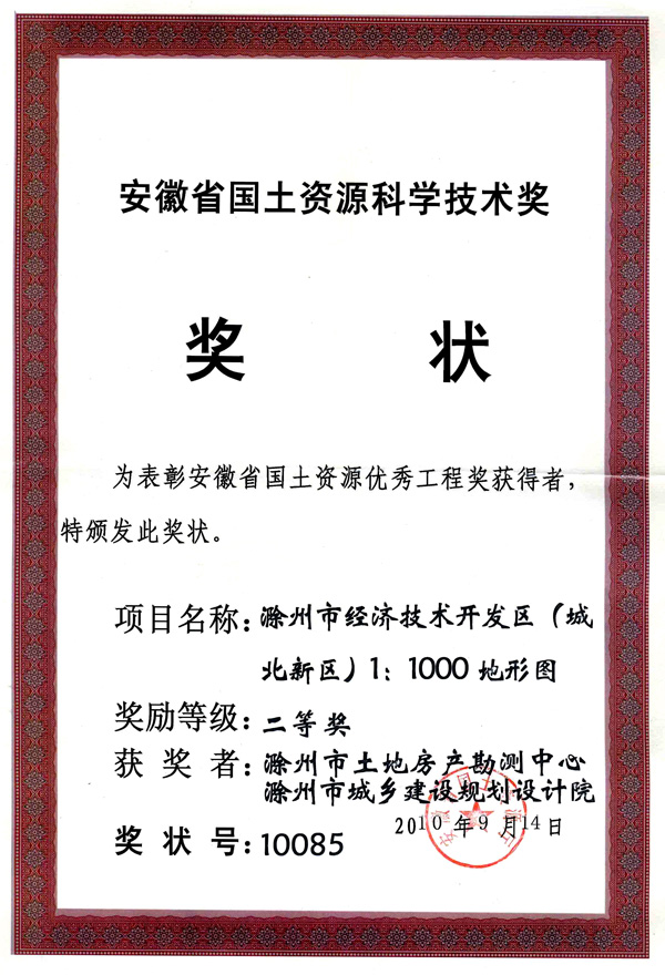 滁州市經(jīng)開(kāi)區(qū)地形圖測(cè)繪規(guī)劃獲獎(jiǎng)證書(shū)