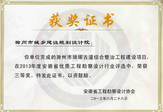 滁州市瑯琊古道綜合整治工程獲獎(jiǎng)證書.