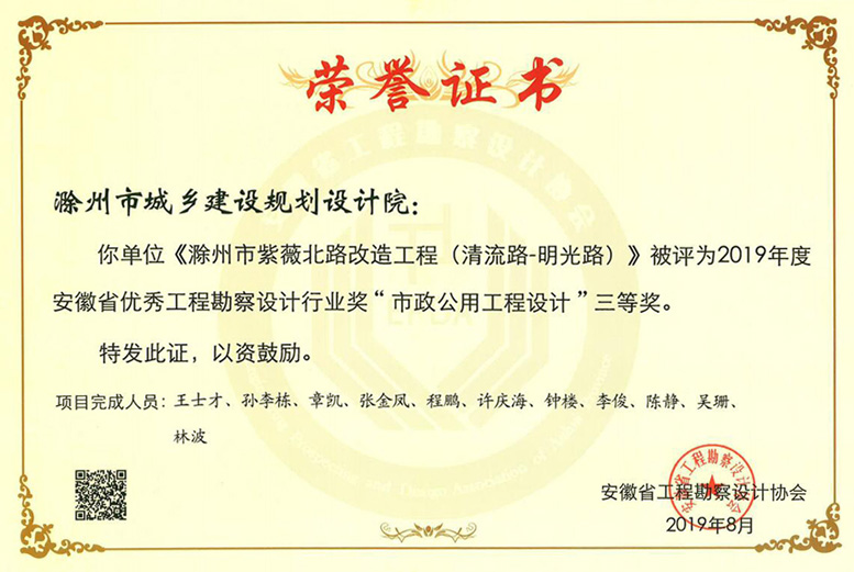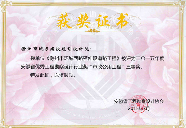 滁州市環(huán)城西路延伸段道路工程獲獎(jiǎng)證