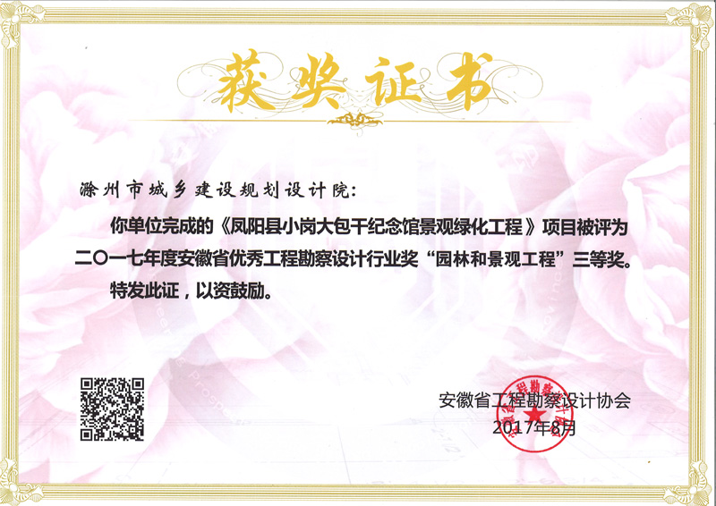 鳳陽縣小崗大包干紀(jì)念館景觀綠化工程獲獎(jiǎng)證書
