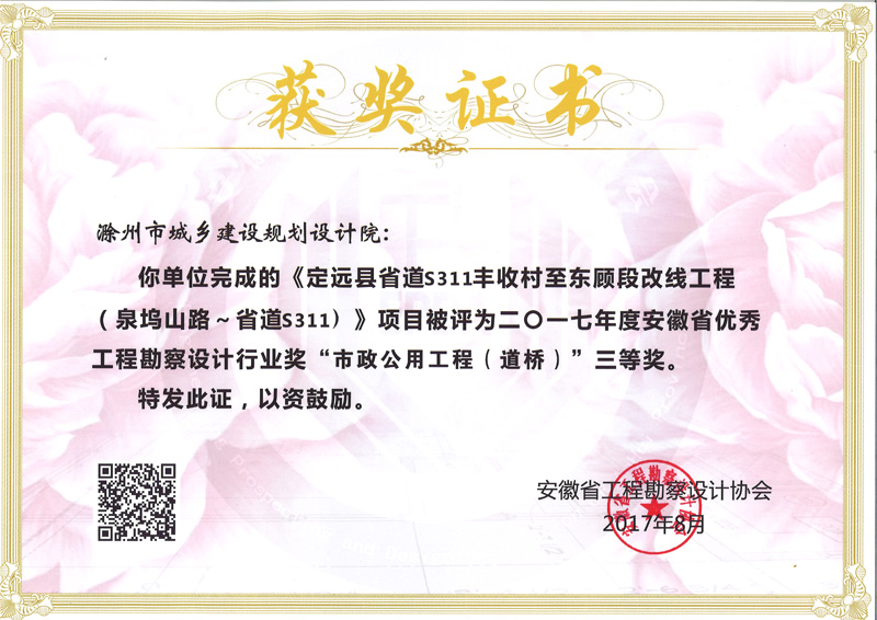 定遠(yuǎn)縣省道S311豐收村至東顧段改線工程獲獎(jiǎng)證書